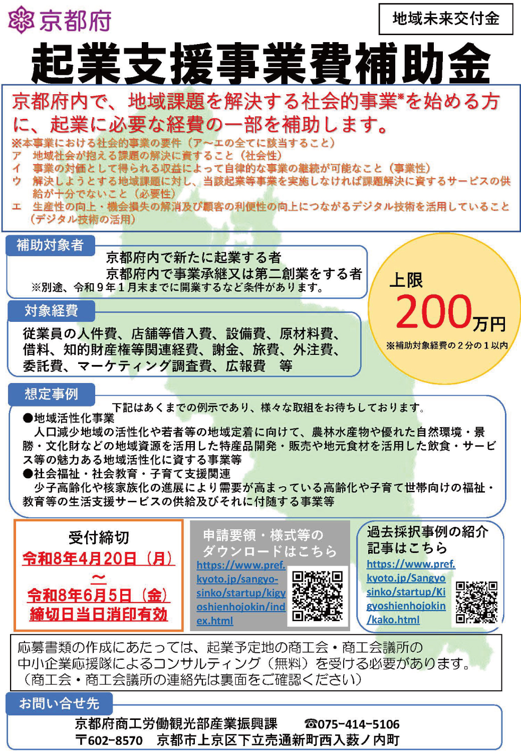 新たに社会的事業を京都府内で起業する者や新たに事業承継又は第二創業する者に対して、